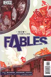 weiter zur Ausgabe #1- #5 Fables #6, erschienen Dezember 2002 bei Vertigo (DC) Autor: Bill Willingham, Zeichner: Mark Buckingham, Tusche: Steve Leialoha, Letterer: Todd Klein, Farben: Daniel Vozzo, Cover: James Jean, Assistent Editor: Mariah Huehner, Editor: Shelly Bond Rosered wird von ihrer Schwester Snowwhite dazu gezwungen, sie auf ihre jährliche Stippvisite des ländlichen Teils der Fairiegesellschaft zu begleiten. Auf der Farm leben all jene Märchenwesen, die wegen ihres Äußeren nicht in die Stadt dürfen. Zusammen mit den beiden Schwestern wird die Reise auch dazu genutzt, um Colin dorthin zurückzubringen. Das sprechende Schwein sieht sich ja mehr als Stadtschwein und will nicht zurück. Auf ihren Weg zur Farm wird klar, dass es schwer für Snowwhite werden wird, wieder etwas Geschwisterliebe zwischen ihr und Rosered aufleben zu lassen. Seit Snowwhite Rosered mit ihrem Mann im Bett erwischt hatte, ist die tiefe Geschwisterliebe der Jugend verschwunden. Als ihr Fahrzeug eine Pause braucht, macht Snowwhite eine seltsame Entdeckung. Irgendwer hat in der Nähe der Farm Gewehrschüsse abgefeuert und dies darf eigentlich nicht möglich sein, da die Gegend vor dem Eindringen durch Menschen geschützt ist. Auf der Farm selbst herrscht Totenstille, als sie dort eintreffen. Die Bewohner haben sich zu einer Versammlung zurückgezogen und auf dieser versucht ein weiteres sprechendes Schwein namens Dun die Bewohner zur Zurückeroberung ihrer alten Reiche zu überreden. Durch das Auftauchen der Schwestern wird die Versammlung aber unterbrochen. Von Dun erfährt Snowwhite auch, dass Weyland Smith, der eigentliche Anführer dieser Ansiedlung, einfach abgehauen ist. Als im Schweinehaus wieder alles ruhig ist, unterhält sich Dun mit Colin. Er fragt ihn, ob es ihm gelungen ist, Verbündete für ihre Sache in der Stadt zu finden. Leider hatte Colin da keinen großen Erfolg. Kurze Zeit später findet man Colins Kopf auf einem Holzspieß. Es sind die kleinen Details und Nebensächlichkeiten, die man in einer kurzen Zusammenfassung der Handlung gar nicht wiedergibt, die diese Serie so unterhaltsam machen. Mit Mark Buckingham als neuen Zeichner gefällt mir diese Serie sogar noch ein bißchen besser. |