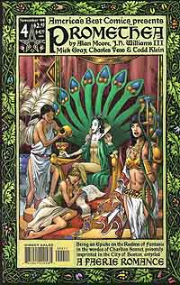 liegen, unterstreichen dann den guten Eindruck nur noch. Autor: Alan Moore, Zeichner: J. H. Williams III, Tusche: Mike Gray, Letterer: Todd Klein, Farben: Wildstorm FX, Editor: Scott Dunbier Promethea bringt die angeschlagene Barbara Shelley zu einem Krankenhaus. Barbara warnt Sophie/Promethea vor neuen Gegnern. Dann wird sie in eine Carekapsel gesteckt. Die bösen Kräfte namens "The Temple" werben neue Auftragskiller an. Die Dämonen Marchosias und Andras werden damit beauftragt, Promethea verschwinden zu lassen. Nicht mal ein Elfenstaubkorn soll von ihr und ihrer Geschichte übrigbleiben. Ihr Auftraggeber ist ein gewisser Magier mit Namen Mr. Salomon. Sophie nimmt Kontakt mit ihrer Freundin Stacia auf. Sie treffen sich vor dem angesagten Club der Stadt, in dem an diesem Abend eine angesagte Rockband spielt. Marchosias und Andras sind nun auch auf dem Weg zum Club namens Trotsky's. Sie hinterlassen einen toten Taxifahrer, der sein Leben nun nicht mehr leben kann. Nicht, wenn andere wissen, was er seiner Enkeltochter angetan hat. Danach kommt es zum Kampf. Die Dämonen werden von den außergewöhnlichen Kräften der neuen Promethea überrascht und flüchten in ein anderes Reich. Stacia wird mit in den Sog in eine andere Dimension gezogen. Der gute Eindruck der ersten Ausgabe wird unterstrichen. Nur muß ich nun sagen, daß ich, nachdem ich alle America´s Best Comic-Serien kenne, Promethea für die am besten gestaltete Serie dieses Labels halte. Die Zeichnungen sind einfallsreich und dynamisch. Die Farben fügen dazu noch Tiefe dazu und die Seitenaufteilung mit all den symbolischen Ausschmückungen ist für den Rest des sehr starken Eindrucks, die diese Zeichnungen machen, zusätzlich verantwortlich. Promethea #3, erschienen im Oktober 1999 bei America´s Best Comic (Homage/DC) Autor: Alan Moore, Zeichner: J. H. Williams III, Tusche: Mike Gray, Letterer: Todd Klein, Farben: Wildstorm FX, Editor: Scott Dunbier, Assistent Editor: Eric Desantis Eine Superheldengruppe steht in einem Flur eines Krankenhauses. Sie mußten eine Niederlage hinnehmen und nun kommen Selbstzweifel auf und es wird mit gegenseitige Beschuldigungen begonnen. Dann taucht eine andere Präsenz im Krankenhaus auf. Promethea ist da. Sie besucht jene Frau, die vor ihr Promethea war. Barbara Shelley wird medizinisch versorgt und hört sich an, was Sophie/Promethea ihr zu sagen hat. Promethea erzählt ihr von der Attacke im Nachtclub und davon, wie ihre Freundin Stacia in eine andere Dimension gezogen worden ist. Stacia befindet sich nun in Immateria. Wie kann ihr Promethea helfen? Wie kommt sie in das magische Land der Ideengestalten und der Legenden? Nur im Geist, lautet die Antwort. Die Reise wird in Gedanken vollzogen. Man muß sich das Land vorstellen und dann ist man dort. Und so geschieht es. Im Misty Magicland trifft Promethea auf Rotkäppchen. Diese gibt ihr den Tip, die verlorene Freundin im finsteren Wald zu suchen. Denn nur dort verirren sich die Menschen. Also geht es ab in den Wald und dort treffen Promethea und Rotkäppchen auf den großen Wolf. Der ist wirklich groß und pustet die beiden durch die Gegend. Danach trennt sich Rotkäppchen von Promethea, um den Lauf des Märchens zu folgen. Nun findet Prometha ihre am Boden zerstörte Freundin. Sie ist im Banne des Weeping Gorilla. Dieser ist traurig und setzt mit deprimierenden Alltagsfloskeln Stacia ziemlich zu. In Immateria ist man den Ideengestalten vollkommen ausgeliefert. Kein Widerwille, der bei einem Erwachsenen aufkommt, wenn er von Märchen und Märchengestalten hört, ist hier wirksam. Nur mit größter Willenskraft schafft es Promethea, sich selbst und ihre Freundin aus dem Bann des Gorillas zu befreien. Danach müssen die Beiden sich wieder vor dem Wolf flüchten. Eine Flucht, die im Kopf stattfindet. So finden sie den Weg zurück nach New York. Dort wird dann auch aus Promethea wieder Sophie. Mit allerhand Ideen, aber recht wenig wirklichen Inhalten, unterhält diese Geschichte. Die Zeichnungen bleiben auf dem guten Niveau und eigentlich hätte man sich wohl eine etwas schwierigere Befreiung der Freundin gewünscht. Und wo sind die Gegner, die Promethea in den letzten Ausgaben so zugesetzt haben? Promethea #4, erschienen im November 1999 bei America´s Best Comic (Homage/DC) Autor: Alan Moore, Zeichner: J. H. Williams III, Charles Vess, Tusche: Mick Gray, Letterer: Todd Klein, Farben: Jeremy N. Cox, Editor: Scott Dunbier, Assistent Editor: Eric Desantis Barbara Shelley liegt im Krankenhaus und die Ärzte wissen, daß es sehr ernst um sie steht. Ihre Promethea-Persönlichkeit begibt sich währenddessen in ein seltsames Zwischenreich, in dem all die Promethea-Persönlichkeiten versammelt sind, die zuvor auf der Erde wandelten. Alle zusammen schauen sich an, was Sophie als nächstes tut. Zusammen mit Stacia fährt Sophie zur Bibliothek, um dort noch mehr Informationen über Promethea zu sammeln. Sie findet ein Buch über den Dichter Charlton Sennet. Sie erfährt so, wie der verheiratete Mann, der Gedichte über das Feenvolk schreibt, durch ein von ihm verfaßtes Gedicht sein Dienstmädchen in Promethea verwandelt. Diese neue Persönlichkeit wird von dem Dichter über alles geliebt. Dadurch verliert er ersteinmal seine Ehefrau. Als das Mädchen schwanger wird, erwartet ihn eine weitere Überraschung. Sie gebärt kein Kind, sondern etwas Unbeschreibliches. Danach stirbt sie und der Dichter bleibt alleine zurück und zerbricht langsam an seiner Einsamkeit und seinen Phantasien. Plötzlich tritt ein Mann an Sophie heran, der sich ihr als Jack Faust vorstellt. Er berichtet ihr von Promethas Feinden. Zum einem gibt es da die Organisation namens "Temple" und dann ist da noch ein Magier mit Namen Benny Solomon. Diese werden ihre Attacken fortsetzen. Als Stacia Sophie aufsucht, weil sie im Netz viele neue Informationen über "Promethea gesammelt hat, ist sie über den seltsamen Mann verwundert, der da Sophies Hand hält. Nun verwandelt sich der bis dahin guta