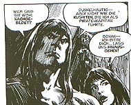 Die Conan-Geschichten aus dem Schwarzweißmagazinen "Savage Sword of Conan" und "Conan Saga", die man bisher nur teilweise in alten "Die Sprechblase"-Ausgaben finden konnten, gehören mit zu den Glanzstücken, wenn nicht sogar zu den Meisterwerken des Duos Roy Thomas und John Buscema. Wer einmal die wunderbar getexteten und gezeichneten Geschichten um den Barbaren, der gerne mehr kämpft als nötig wäre und dem jede Frau zu Füßen liegt, gesehen hat, der wundert sich immer noch, wieso das Fantasygenre in den amerikanischen Comics immer so verdammt kurz gekommen ist und wenn es mal Versuche von ähnlichen Werken gegeben hat, dann waren diese meist stümperhaft gemacht, da erinnert man sich nur schaudernd an die Comics zum D&D-Rollenspiel von DC. Ach, da wir gerade beim Rollenspiel sind. Jeder der mal ein Fantasyrollenspiel gespielt hat, wird beim Lesen auch merken, woher die meisten Rollenspielautoren ihre Ideen hatten, fast jede Conan-Geschichte, egal ob in Roman- oder Comicform, wäre auch für einen netten Rollenspielabend gut zu gebrauchen. Conan #2, erschienen im September 2002 bei Generation Comics (Panini) Autor: Roy Thomas, Zeichner: John Buscema, Übersetzer: Michael Strittmatter In der ersten Geschichte rettet sich Conan, nachdem seine derzeitigen