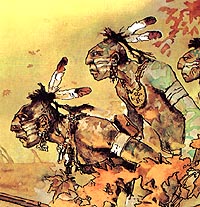 Fort Wheeling/Band 1/erschienen bei Comicothek von Hugo Pratt Die Geschichte, die im ersten Band der Reihe "Fort Wheeling" erzählt wird, beginnt mit der Ermordung der Familie von Logan, einem stolzen Indianerhäuptling, der bis zu diesem Zeitpunkt ein friedliches Zusammenleben mit den weißen Pionieren und Siedler praktizierte, die sich am Fluß Ohio niedergelassen hatten. Nun zählt für Logan nur noch die Rache. Allen Warnungen seiner Freunde und Berater zum Trotz, holt er sich die Erlaubnis der anderen Häuptlinge, um die Siedler anzugreifen und einen Krieg gegen die Weißen zu führen. Dies hat für die Siedler und Soldaten rund um das Fort Wheeling zur Folge, daß sie sich nun in das befestigte Lager begeben oder zum Gegenangriff in den Krieg gegen die Indianer ziehen. In diesem Krieg begegnen die Teilnehmer den verschiedensten Menschen, die alle aus rein persönlicher Motivation handeln, die aber nicht selten auf einem einfachen Rachetrieb basiert. Auch ist im Jahre 1774 klar, daß die Kolonien langsam nach einer Selbstverwaltung verlangen und sich von ihrem europäischen Mutterland loslösen möchten. Auch in den Regimentern, die nun gegen die Indianer ausrücken, laufen junge Männer nebeneinander, die aus den verschiedenen Lagern kommen. So sind da Criss Kenton, ein junger Virginier und Patrick Fitzgerald, ein englischer Aristokrat, die sich freiwillig als Späher melden und die ihr Regiment ungewollt direkt in einen Hinterhalt der Indianer führen. Doch nachdem sie den ersten Schock überstanden haben, stellen sie sich der Gefahr des Schlachtfeldes. Nicht nur um Criss und Patrick kümmert sich der Autor und verpaßt ihnen einen Hintergrund und eine persönliche Geschichte, so daß sie für den Leser echt wirken. Fast jeder Charakter, der in dieser um historische Authentizität sehr bemühten Abenteuergeschichte auftaucht, kann auf eine solche zurückschauen. Dabei begegnen dem Leser immer wieder historische Figuren, die es wirklich gegeben hat. Hugo Pratt, der diese Serie während seines vierzehn Jahre andauernden Argentinienaufenthalts geschaffen hat, beweist schon hier sehr viel Gefühl für eine spannende Abenteuergeschichte, die den Leser über die gesamte Länge glänzend unterhält. Bei den Zeichnungen verhält es sich ein wenig anders. Erst glaubt man in den in einem starken schwarzweiß Kontrast gehaltenen Bildern einfache Bilder von Gesichtern und Personen zu erkennen. Dann merkt man, daß man es mit einem wahren Meister zu tun hat, der nur das für das Bild Wichtigste zeigt und dabei auch geschickt mit Perspektive und Schatten arbeitet. Manchmal kann man eben mit sehr wenig den größtmöglichen Nutzen erzielen. Dies gelingt Hugo Pratt hier sehr gut und schon verliert man sich ganz in den Bildern. Schnell weiß man dann auch, warum er bei seinen zahlreichen Bewunderern und Fans ein so hohes Ansehen genießt. Zwar ist Hugo Pratt vor allen durch die Abenteuer seines Charakters Corto Maltese bekannt geworden, doch zeigt sich mit diesem Album, das von dem schweizerischen Verlag Comicothek herausgebracht wurde und dessen Markenname wirklich wie kaum ein anderer für qualitativ hochwertige Comickost steht, daß auch Pratts Frühwerke mehr als einen Blick lohnen. |