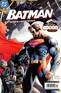 so bekommt es Batman mit Superman höchst persönlich zu tun. Da Jeph Loeb ja zu besser geschriebenen Abenteuern fähig ist, darf man seine neue Batmanserie als sehr unterhaltsamen Mainstream bewerten, der durch die Fähigkeiten von Jim Lee zum reinen Augenschmaus gemacht wird. Das Hirn braucht also nicht überanstrengt werden und nach dem Ende dieser Ausgabe könnte meine Theorie, die ja besagte, daß Thomas Elliot der böse Kerl im Hintergrund ist, doch ins Wanken geraten. Also hat mein Hirn wenigstens nach der Lektüre wieder was zu tun. Batman - Die neuen Abenteuer #4 von 6, erschienen im September 2003 bei Panini Autor: Jeph Loeb, Zeichnungen: Jim Lee, Tusche: Scott Williams, Übersetzung: Steve Kups Batman ist richtig sauer. Sein Jugendfreund liegt tot in einer Gasse und wen findet er bei der Leiche? Natürlich ist es wieder mal der Joker, der einen weiteren Freund (Partner) von Batman umgelegt hat. Dies macht Batman wie gesagt richtig sauer. So hört er den Unschuldsbeteuerungen seines ewigen Feindes auch nicht zu. In seinen Gedanken ist Bruce ganz mit all dem Leid beschäftigt, das der Joker ihm und seinen Vertrauten zugefügt hat. Und so scheint Batman diesmal keine Gnade zu kennen. Später konzentriert er sich wieder auf andere Dinge. Die ganzen Kämpfe mit seinen ältesten Gegnern geben ihm zu denken und dann ist da noch die Sache mit Selina. Außerdem hat Nightwing wieder mal keine Angst davor, ihm zu sagen, wie es in ihm aussieht. Dick Grayson scheint ihn fast ein wenig besser zu kennen als Bruce sich selbst. Dann tritt der Riddler in Aktion. Batmans Kampf wird von jemanden beobachtet, um dessen Gesicht ein dicker Verband gehüllt ist. Wie schon gesagt, diese Serie ist ein Augenschmaus und alte Leser werden mit einem regelrechten "Who is Who" des Batmanuniversums bedient, da alle wichtigen Batmanfreunde und Gegner in der Storyline namens "Hush" eine Rolle zu spielen haben. Damit ist diese Serie nicht nur ein weiteres Paradebeispiel für die Zeichenkunst von Jim Lee, sondern auch eine Zusammenfassung und Bestandsaufnahme eines langen Heldenlebens. Batman - Die neuen Abenteuer #5 von 6, erschienen im November 2003 bei Panini Autor: Jeph Loeb, Zeichnungen: Jim Lee, Tusche: Scott Williams, Übersetzung: Steve Kups Batmans Nachforschungen führten ihn zu Ra's al Ghul, um diesen aber dazu zu bekommen, Batman die Informationen zu geben, die dieser braucht, mußte er das richtige Druckmittel finden. So entführt Batman Talia, die Leiterin von LexCorp und Tochter Ra's. Ra's läßt sich auf einen Handel ein. Wenn Batman ihn in einem Zweikampf besiegt, sagt Ra's Batman, was er weiß. Talia wird währenddessen von Catwoman bewacht, die überraschend von Lady Shiva, einer gefährlichen Killerin, die im Auftrag von Ra's arbeitet, angegriffen. Später muß sich Batman noch mit Huntress und Scarecrow herumschlagen, bevor er erfährt, wer für das ganze Chaos verantwortlich ist, das ihm und seinen Vertrauten widerfahren ist. Weiterhin ist diese Serie wohl nichts anderes als eine Hommage an die besten Batman-Geschichten und Schöpfungen der vielen Batman-Autoren und -Zeichner. Daß dabei auch noch eine recht spannende Geschichte herausgekommen ist, wird da fast schon zur Nebensache. Batman - Die neuen Abenteuer #6 von 6, erschienen im Januar 2004 bei Panini Autor: Jeph Loeb, Zeichnungen: Jim Lee, Tusche: Scott Williams, Übersetzung: Steve Kups Jason Todd weilt also wieder unter den Lebenden und hat für all den Ärger gesorgt, der Batman in letzter Zeit widerfahren ist. Und nun wird Jason sich an Batman und an Robin endgültig rächen. Doch irgendetwas läßt Batman aufhorchen. Warum nennt der angebliche Jason Todd ihn nicht Bruce? Ist es vielleicht doch nicht Jason Todd, sondern nur jemand, der sich für diesen ausgibt? Wurde vielleicht jemand ganz anderes in Ra's al Ghul's Lazarusgrube zum Leben erweckt, der auch herausgefunden hat, wer sich hinter der Batman-Maske verbirgt? Und so warten noch ein paar weitere böse Überraschungen auf Batman. Spannend geht diese Geschichte zu Ende und ein paar gute Überraschungen hat Jeph Loeb noch fürs Ende parat gehalten. Obwohl ich ja schon immer wußte, dass der extra für diese Serie erdachte Jugendfreund namens Thomas Elliot sicherlich noch eine wichtige Rolle spielen würde. Ansonsten läßt sich der Autor auch noch viele Möglichkeiten für weitere Geschichten am Ende offen. |