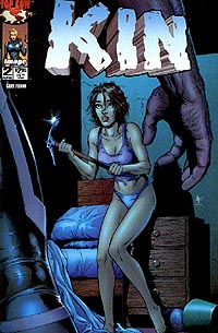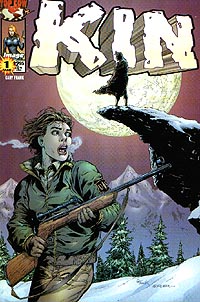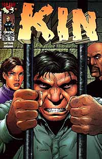 (Top Cow) Eine Yacht im Hafen von Bluebay, Virginia. An Bord erhält ein Mann namens Mack einen Anruf. Die Nachricht lautet: "Sie haben Pepper getötet. Du bist der Nächste." Und schon dringt jemand gewaltsam in das Innere der Yacht ein. Im Three Teeth National Park, Alaska wird eine Wildhüterin aus ihrem Schlaf gerissen. Ihr Besucher ist wach. Er hat sich von seinen Fesseln befreit und kann sogar reden. Der Urzeitmensch scheint aber etwas verwirrt zu sein. Auf der Yacht kämpft Mack um sein Überleben. Nacheinander schaltet er seine Angreifer aus. Als ein Sprengsatz explodiert, springt er in das rettende Wasser. Elspeth Leakey erfährt den Namen ihres Gastes. Er heißt Bobinyaraskoodinnogri. Sie nennt ihn Bob. Dann überkommt Bob eine böse Ahnung. Er muß zu seinen Leuten. Die Menschen, die von seinem Volk "Slender" genannt werden, scheinen den Wohnort seiner Leute entdeckt zu haben. Vor kurzen ist dies schon in der Schwesterkolonie passiert und die Folge des Eindringens war die totale Zerstörung dieser Kolonie. Er bietet Elspeth darum, ihn dahin zurückzubringen, wo sie ihn gefunden hat. Mack versucht sich bei einem Freund Klarheit über die Dinge zu verschaffen, die gerade passiert sind. Doch auch Tom kann sich nicht erklären, warum jemand Pepper umbringen sollte. Daß Gaskell zu einem solchen Schritt fähig wäre, kann er nicht glauben. Mack scheint sich da nicht so sicher zu sein. Jemand bekommt den Auftrag, den Ranger, der den angeschossenen Fremden gefunden hat, auszuschalten. Kurzweilig und gut gezeichnet. Gerade die Gesichtsmimik, die Garry Frank seinen Charakteren geben kann, haben es mir angetan. Diese sind schon fast so ausdrucksstark wie die von Kevin Maguire, der ja der absolute Meister auf diesem Feld ist. Kin #3, erschienen im Mai 2000 bei Image Comics (Top Cow) Story und Artwork: Gary Frank, Farben und Letterer: Bongotone's Paul Mounts & Ken Wolak, Editor: Frank Mastomauro Mack ist unterwegs in die Berge. Elspeth kann die seltsame Heilung von Bob immer noch nicht verstehen. Die Kraft namens "Kukya", die Bob als Quelle der Heilung nennt, ist angeblich noch zu viel mehr in der Lage. Sie steckt angeblich in allem und jeden (Star Wars sei gegrüßt). Elspeths Vater ist besorgt. Eigentlich ruft ihn Elspeth an jeden ersten Montag eines Monats an. Auch ein Anruf bei Elspeths Kollegen bringt keine Beruhigung. Und als er von Elspeths Kollegen erzählt bekommt, daß die Armee in den Bergen sehr aktiv geworden ist, beunruhigt ihn das noch mehr. Bob öffnet den Zugang zu einem Vorposten seines Volkes. Dann bittet er Elspeth darum, eine der Uniformen anzuziehen, die seinem Volk gehört. Elsepeths Kollege bekommt Besuch. Er soll Elspeths Vater in England anrufen und diesem erzählen, daß alles in bester Ordnung sei. Bob und Elspeth erreichen Bobs Heimat. Überall laufen bewaffnete Soldaten herum. Bob muß nun die Ansiedlung versiegeln. George Leakey ist dazu entschlossen, nach Alaska zu fliegen. Er will wissen, was dort passiert und ob seine Tochter in Schwierigkeiten steckt. Von einem Freund bekommt er einen Kontaktmann genannt, der ihm sicher eine große Hilfe sein würde. Bob erklärt Elspeth, wie die Tarnvorrichtung an ihrer Uniform funktioniert. Gut getarnt dringen sie in das Innere der Ansiedlung ein. Die Selbstzerstörung funktioniert aber nicht, was bedeutet, daß noch einige der Bewohner noch am Leben sind. Aus den Inhalten eines Gespräches, daß zwei Soldaten führen, glaubt Elspeth herauszuhören, daß sie die Antworten auf alle Fragen in Nevada finden kann. Zurück an Elspeths Geländewagen sehen sie einen weiteren Uniformierten, der das Fahrzeug neugierig begutachtet. Bob stürzt sich in einem plötzlich in ihm wachgerufenen Beserkerrausch auf diesen. Aus der Not feuert der Angegriffene mehrere Schüsse auf den Angreifer ab. Als Antwort darauf wird er selbst von Elspeth angeschossen. Nun liegen Mack und Bob schwer verletzt am Boden. Es bleibt spannend, doch irgendwie erfährt man viel zu wenig über Bobs Volk. Kin #4, erschienen im Juli 2000 bei Image Comics (Top Cow) Story und Artwork: Gary Frank, Farben und Letterer: Bongotone's Paul Mounts & Ken Wolak, Tusche: Jason Gorder, Editor: Frank Mastomauro Mack wird von Bob medizinisch versorgt. Elspeth macht sich Sorgen. Auch Elspeths Vater macht sich Sorgen und ist enttäuscht, als er feststellen muß, daß ihm sein Freund statt einem kampferfahrenen Agenten einen Butler vermittelt hat. Anderswo machen sich zwei Personen zwar keine Sorgen, doch es würde ihnen besser gehen, wenn sie wüßten, wo Elspeth und der verschwundene Neandertaler stecken. Mack, Bob und Elspeth beschließen nach Nevada aufzubrechen. George Leakey muß feststellen, daß sein neuer "Butler" anscheinend doch die ideale Person ist, die mit ihm auf die Suche nach seiner Tochter geht. Elspeth muß noch ein paar Sachen aus ihrer Wohnung holen. Natürlich wird sie dort schon von feindlichen bewaffneten Einheiten erwartet. Doch diese werden von Bob und Mack ausgeschaltet. In dieser Ausgabe entsteht ein wenig Leerlauf, da das nächste Ziel für die Helden schon längst feststand, hätte man dort auch schon ankommen können Kin #5, erschienen im August 2000 bei Image Comics (Top Cow) Story und Artwork: Gary Frank, Farben und Letterer: Bongotone's Paul Mounts & Ken Wolak, Tusche: Lee Townsend, Editor: Frank Mastomauro & Reane Geerlings, Editor in Chief: Matt Hawkins Mack, Bob und Elspeth suchen sich eine passende Hilfe für ihr Eindringen in eine Basis des S.I.A. Diese finden sie in der Person von Francis, der sich anscheinend gut mit dem Umgang und dem Beeinflussen von elektronischen Sicherheitssystemen auskennt. Elspeths Vater erreicht Amerika und trifft auf seinen indischen Chauffeur Arvinda Singh (hier wird auch wirklich jedes britische Klischee ausgepackt). Dieser darf direkt seine Künste im Verfolgerabschütteln unter Beweis stellen. Um das Mißverständnis auszuräumen, daß Bob keinen Sinn für Humor besitzt, sucht er sich das denkbar schlechteste