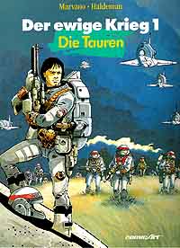 Der ewige Krieg/Band 1: Die Tauren, erschienen bei Carlsen (ComicArt) Autor: Joe Haldeman , Zeichner: Marvano Mit der Entdeckung des Kollapsensprungs begann die Kolonisierung des Alls. Doch als eine Sonde mit der Nachricht der Vernichtung eines Kolonieschiffes durch ein feindliches außerirdisches Volk zurück zur Erde kommt, versetzt man die Erde in den Kriegszustand. Die menschliche Elite, deren geistige als auch körperliche Leistungen über dem Durchschnitt liegen, wird in einem mörderischen Training auf den Ernstfall vorbereitet. Schon in diesen Wochen werden die Soldaten mit der Schonungslosigkeit und Härte des Krieges vertraut gemacht und es gibt zahlreiche Opfer zu beklagen. Jeder Fehler kann den eigenen Tod und den Tod der Kameraden zur Folge haben. Der Soldat ist nur ein Mittel, damit die Menschheit in ihrem Kampf gegen einen bis dahin noch völlig unbekannten Gegner gewinnen kann. Es ist den Kriegsplaner jedes Mittel recht, damit die Soldaten auch das tun, was sie von ihrer militärischen Führung gesagt bekommen und im Ernstfall können die letzen moralischen Bedenken auch von anderen implantierten Gefühlen überlagert werden. Dies ist die Geschichte des Soldaten Mandella und die Geschichte des Kriegs gegen die Tauren. Joe Haldeman durchlebte den Schrecken des Krieges, als er selbst nach Vietnam geschickt wurde. Er kam aus diesen Krieg mit einer Verletzung und einem Verdienstorden zurück und er begann schnell mit seinem Kreuzzug gegen den Krieg. Er schrieb ein Jugendbuch, in dem er seine Erfahrungen aus Vietnam niederschrieb und er schrieb den Roman "Der ewige Krieg", der erst als Mehrteiler in der Zeitschrift "Analog" erschien und dessen Veröffentlichung dem Herausgeber viele böse Briefe einbrachte, da diese Briefeschreiber nicht mit einem Krieg konfrontiert werden wollten, der nicht zu gewinnen war und in dem die Soldaten in jeder freien Mitnute miteinander Sex hatten und dazu noch durch Drogeneinsatz gefügig gemacht wurden. Der Schrecken des Vietnamkrieges war so allgegenwärtig, daß er kein Thema einer Science Fiction Geschichte sein durfte. Doch als der Herausgeber all die anderen Leser um ihre Meinung bat, war die positive Reaktion auf die Geschichte aufgrund ihrer Ernsthaftigkeit und Aktualität in der Mehrheit und so wurde die Geschichte auch weiter fortgesetzt. Als der Roman endlich fertig war und ein Verleger gefunden wurde, der eine Hardcoverausgabe herausbringen wollte, begann ein Siegeszug, der mit zahllosen Folgeauflagen, Auszeichnungen und den Ruf eines Klassikers der Science Fiction noch kein Ende gefunden hat. Auch die Comicadaption des Romans macht den Schrecken des Krieges deutlich und schildert von der Vernichtung aller höheren menschlichen Werte, nach denen wir eigentlich als Individuum handeln sollen. Doch sobald ein Mensch in den Krieg zieht, scheint jeder Skrupel verlorenzugehen und von einer höheren Macht ausgeschaltet zu werden. Haldeman beweist aber auch, daß er genug Ideen hat und über genug akademisches Wissen verfügt, um nicht nur als Kriegsgegner, sondern genauso auch als SF-Autor zu glänzen und dank ihm hatte die SF-Literatur schon 1972 etwas hervorgebracht, das erst ein Jahrzehnt später in vergleichbarer Qualität von Filmemachern wie Oliver Stone oder Stanley Kubrik für das Medium Film geschaffen wurde. |