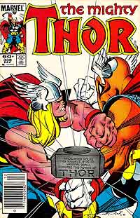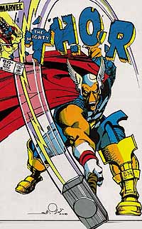 weiter mit Ausgabe #338 The mighty Thor #337, erschienen im November 1983 bei Marvel Autor & Zeichner: Walt Simonson, Letterer: John Workman, Farben: George Roussos, Editor: Mark Gruenwald In der Tiefe des Alls wird etwas sehr Mächtiges geschmiedet. Die Wucht des Schmiedehammers ist noch weit entfernt zu spüren. Dr. Donald Blake vergnügt sich in einem Stadtpark, als er plötzlich von zwei Personen in einen Wagen gezerrt wird. Nick Fury, der Leiter von SHIELD, gibt sich nun zu erkennen und er fordert den Doktor, ohne sich erst auf eine Diskussion einzulassen, dazu auf, sich in Thor zu verwandeln. Der Doktor ist zwar verwirrt, woher Nick Fury weiß, was er weiß, doch er kommt der Bitte sehr schnell nach. Als sie das fliegende Hauptquartier von SHIELD erreicht haben, unterrichten Fury und Jasper Sitwell den Donnergott über eine angsteinflößende Entdeckung, die eine Sonde im All gemacht hat. Die Sonde beobachtet, wie ein riesiges Raumschiff, welches sich auf direkten Kurs auf die Erde zubewegt, einen Stern passierte und ihm sämtliche Energie raubt. Sofort macht sich Thor auf, dem Raumschiff entgegen zu fliegen. In Asgard ist Sif angekommen, die einem großen Kummer verfallen ist, da Thor lieber auf der Erde den Beschützer spielen will als an ihrer Seite zu leben. Bei Balder sucht sie nach Trost, doch dieser ist, nachdem er dem Reich der Todesgöttin entkommen ist, nicht mehr der, der er einst war. Auch Heimdall, der Wächter der Regenbogenbrücke, kann ihr kaum Trost spenden, dazu ist wohl nur Allvater Odin in der Lage. Thor erreicht das Raumschiff und stößt auf erheblichen Widerstand, der von der starken Bordkanone des Schiffes ausgeht. Als er sich gewaltsam Zutritt in das Innere des Schiffes verschafft hat, erwacht ein starker Gegner aus seinem Tiefschlaf. Loki langweilt sich in seinem Exil. Da kommt es ihm recht, daß eine Schar Krieger, die hinter einem kleinen Troll herjagen, auftauchen. Doch bevor die Krieger das Biest erreichen, wurde dieses schon ein Opfer von Lorelei, einer Frau, dessen Charme fast jedes Wesen sofort verfällt. Loki ist von Lorelei begeistert und er bittet sie darum, sich mit ihm zurückzuziehen. Thor ist von dem Kampfgeist seines Gegners überrascht, dieser glaubt, daß Thor ein Dämon ist und er legt sein ganzes Kampfgeschick darin, den Gegner zu besiegen. Der Donnergott schlägt ersteinmal auf das Schiff ein, um etwas Zeit zu gewinnen und sofort reagiert der Bordcomputer, um eine geeignete Welt zum Notlanden zu finden. Thor merkt nicht, daß er im Verlauf des Kampfes der Erde immer näher kommt und daß sein Hammer nicht in seinen Händen weilt. Plötzlich verwandelt er sich in seine menschliche Form zurück. Der Gegner nutzt dies sofort aus und schlägt den harmlosen Doktor nieder. Es folgt der Absturz auf die Erde und der Außerirdische entdeckt den Stock des Doktors, den er wütend vor eine Wand schlägt. Dies hat natürlich zur Folge, daß er sich nun in Thor verwandelt. Er spürt sofort, wie mächtig er geworden ist und diese Macht bekommen die SHIELD-Einheiten zu spüren, die sich sofort auf den Weg zur Absturzstelle gemacht haben. Plötzlich taucht Odin auf und er nimmt den Fremden, den er für Thor hält, mit sich. Zurück bleibt ein verzweifelter Mann, der seinem Vater hinterher schreit. Gleich auf zweierlei Weise hat mich dieses Comic, als ich es vor circa 18 Jahren das erste Mal in den Händen hielt, tief beeindruckt. Zum einen durch die Zeichnungen, die anders waren als jene, die man sonst in Superheldencomics vorfand. Irgendwie unterschieden sich die Zeichnungen erheblich von dem Durchschnitt und dies auch noch dahingehend, daß sie von einer äußerst guten Qualität waren. Da hatte ein Zeichner einen ganz eigenen Stil, durch den er sich von dem Durchschnitt unterschied und dies auf positive Art und Weise. Schnell schaute ich nach dem Namen des Zeichners, der auch noch der Autor der Geschichte war und ich war noch stärker beeindruckt, denn auch die Geschichte war herausragend und die Endszene brannte sich für alle Zeiten in mein Hirn ein. Ein verzweifelter und zum Mensch gewordener Donnergott stand da verzweifelt auf dem Wrack eines Raumschiffes und er war seines Hammers beraubt und von seinem Vater auf der Erde hilflos zurückgelassen worden. Super. Walt Simonson hieß dieser Autor und Zeichner und er sollte etwas ganz Besonderes aus der Heftserie namens "The mighty Thor" machen. Während andere Autoren und Zeichner (der gute Jack Kirby bleibt da natürlich ausgenommen) nur harmlose Abenteuer schufen, die höchstens durch Schurken wie den Executioner und den Absorbing Man interessant gemacht wurden, schuf Simonson direkt mit der ersten Seite den Anfang zu einer riesigen Saga, die sich über zahllose Nebenhandlungen und Ausgaben zog und die aus dieser Mainstreamserie etwas Besonderes machte und somit zu einigen der besten amerikanischen Superheldencomics überhaupt wurden, die jemals bei Marvel erschienen sind. In der ganzen Welt wurden diese Ausgaben gefeiert und mit Preisen überhäuft. Nur hier in Deutschland, wo der größte Teil dieser Ausgaben nur als Zweitstory in den alten Spider-Man-Heften von Condor erschienen sind, scheint sich dies noch immer nicht so richtig herumgesprochen zu haben. Die ersten Ausgaben wurden zwar in dem Marvel Exclusiv-Band 15 neu abgedruckt, auf weitere Veröffentlichungen wartet man aber bis jetzt vergeblich. Dies liegt sicherlich an einem fehlenden Interesse seitens der Käufer. Ja, es gibt immer noch genug Menschen, die nicht wissen, was wirklich gute Comics sind. The Mighty Thor #338, erschienen im Dezember 1983 bei Marvel Autor & Zeichner: Walt Simonson, Letterer: John Workman, Farben: George Roussos, Editor: Mark Gruenwald, Editor in Chief: Jim Shooter Donald Blake steht auf einem fremden Raumschiff und ist verzweifelt. Ein Außerirdischer hat ihm den Hammer genommen und ist verschwunden. Durch Nick Fury erfährt Blake, daß der Fremde von Odin höchstpersönlich geholt wurde und sicherlich wird Od
