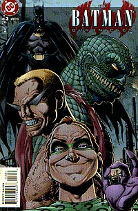 eines auf die Politikebene zustrebenden Medienbosses. Kurzweilig, aber nicht besonders interessant. "Death Mask" Autor: Doug Moench, Zeichner: Brian Apthorp, Tusche: Terry Austin, Farben: David Hornung, Letterer: Todd Klein. Eine bei einem Raub benutzte Maske wird für alle Lebewesen, egal ob Mensch oder Tier, zum Unglücksbringer. Eine toll erzählte Geschichte, die vollkommen ohne Worte auskommt. Dies sollte auch eine kleine Tradition innerhalb dieser Reihe werden. The Batman Chronicles #2, erschienen im Herbst 1995 bei DC "The Space between Good and Evil" von Alan Grant (Autor), Liam Sharp (Zeichner), Mike Sellers (Tusche), Sherilyn van Valkenburgh (Farben), Ken Lopez (Letterer) Batman und Robin treffen auf einen Rockmusiker, der als ein in einem Cyborg verwandelten Racheengel hinter seinem ehemaligen Manager und seiner Band her ist. Diese wollten den uncharismatischen Songwriter ausboten und als es zum Streit kam, endete die Karriere des angehenden Rockstars in einem Koma. Als er wieder erwachte, ist er durch die Rechte, die er an seinen Songs hat, reich geworden. In einer illegalen Klinik in Brasilien läßt Feedback, so der Name der traurigen Gestalt, seinen von Geburt aus schwächlichen Körper aufrüsten. Als Superkiller sucht er seine ehemaligen Band auf und als er mit ihnen fertig ist, knöpft er sich nun seinen alten Manager vor. Nur die beschwichtigen Worte Robins halten ihn auf. Ein neuer trauriger Schurke wird erschaffen und dingfest gemacht. Wie bei allen Geschichten dieser Ausgabe sind die Zeichnungen von durchschnittlicher Qualität. Alles ist nett zu lesen, aber nichts besonderes. "Goin` Downtown" von Chuck Dixon (Autor), Rodolfo Damaggio (Zeichner), Rob Light (Tusche), Ian Laughlin (Farben), John Costanza (Letterer) Harold, der stumme Gehilfe von Alfred, muß sich auf eigene Faust zu Besorgungen nach Gotham aufmachen. Dort verhindert er in einem Kaufhaus einen Raubüberfall. Wieder eine Geschichte ohne Worte. "Commissions" von Doug Moench (Autor), Dusty Abell (Zeichner), Terry Austin (Tusche), Debbie McKeever (Farben), John Costanza (Letterer) Sarah Gorden ist nun die neue Police Commissioner von Gotham. Ihr Mann wurde Opfer einer politischen Intrige, die ihn dazu brachte, sich für das Amt des Bürgermeisters aufstellen zu lassen. Sarah ist aber immer noch Polizistin und weiß, wie man einen panikmachenden Straftäter ausschaltet. Netteste Geschichte dieser Ausgabe, da sie sich mal mit Menschen, die den Leser interessieren könnte, befaßt und ihm Einblick in das Seelenleben eines dieser Menschen gibt. The Batman Chronicles #3, erschienen im Winter 1995 bei DC "Riddle of the jinxed Sphinx" getextet von Doug Moench, gezeichnet von Brian Stelfreeze, Bill Sienkiewicz, bunte Farbe von James Sinclair, Buchstaben von Ken Lopez Der Riddler hat sich vorgenommen, der Polizei keine Rätsel mehr zu senden, wenn er ein Verbrechen verübt. Dadurch ist die Chance viel größer, daß Batman nicht die Lösung seiner Rätsel herausfindet und ihn dadurch stoppen kann. Und als er dies auch dann so macht, scheint er plötzlich einen Erfolg nach dem anderen zu haben. Aber irgendwie findet er dies alles auch sehr langweilig. Wo bleibt der Spaß und die Herausforderung? Am Ende ist dann wieder alles beim Alten. Nette Story, nette Zeichnungen. "The first Cut is the Deepest" erzählt von Alan Grant, gezeichnet von Jennifer Graves, getuscht von Wayne Faucher, bunte Farbe von Bjarne Hansen, Buchstaben von Clem Robins Mr. Zsasz erzählt seiner Psychoanalytikerin, wie er zu Mr. Zsasz geworden ist. Einst war er ein erfolgreicher Geschäftsmann. Als seine Eltern starben, fiel er in eine tiefen Krise. Mit Hilfe des Glücksspiels suchte er nach Ablenkung. Als er eines Tages alles verlor, war nur noch eine tiefe Leere in ihm. Er wollte sich das Leben nehmen, doch dann störte ihn dabei ein Obdachloser, der, bevor sich Zsasz in die Tiefe stürzen konnte, noch seine Wertgegenstände wollte. Es kam zum Kampf und am Ende entdeckte Zsasz in den Augen des Obdachlosen die gleiche Leere, die auch von ihm Besitz ergriffen hatte. Und so befreite er nun diesen von seinem Leiden. Und so wurde das Morden von Menschen, die er nun nur noch Roboter und Zombies nennt, seine Berufung und er ritzte sich seine erste Kerbe in seine Haut. Nachdem er der Zuhörerin alles erzählt hat, lockt er sie ganz nahe an seinen Käfig und bekommt sie zu greifen. Auch hervorragend gezeichnet. "Working' my Way back to you" getextet von Chuck Dixon, gezeichnet von Gabriel Gecko, getuscht von Robert Campanella, bunte Farbe von Patricia Mulvihill, Buchstaben von Clem Robins Killer Croc wird aus dem Sumpf gejagt, flüchtet in einen Zugwaggon, schmeißt ein paar Herumtreiber aus diesem heraus, muß sich gegen einen in den Waggon geladenen Stier verteidigen, den er danach verspeist. Dann hat er die Stadt erreicht. Etwas zu kurzweilig. Dies war dann eine sich nur mit Schurken befassende Ausgabe. Die guten Zeichnungen der ersten beiden Geschichten lassen für die Zukunft dieser Serie einiges erwarten. The Batman Chronicles #4, erschienen im Frühjahr 1996 bei DC Mit dieser Ausgabe befinden wir uns inmitten eines Batman-Großereignises mit Namen "Contagion". Dieses wurde auf deutsch bei Dino auch unter dem Titel "Die Seuche" in den Batman-Ausgaben herausgebracht. Damit wurden auch zwei der drei Geschichten dieser Ausgabe ins Deutsche übersetzt. "Hitman" von Garth Ennis (Autor), John McCrea (Zeichner), Glen Murakami (Farben), Ken Lopez (Letterer) Batman trifft auf zwei Gauner. Der eine heißt Eckstein und ist auf der Jagd nach Tommy Monaghan, auf den ein lokaler Gangsterboß ein Kopfgeld ausgesetzt hat. Und es scheint, als würde er diesen jetzt stellen können. Monaghan, ein Auftragskiller mit telepatischen Fähigkeiten, der dazu noch durch Dinge hindurchsehen kann, ist seinerseits auf der Jagd nach einem Wesen, das vom Militär als Überträger von Krankheiten und Seuchen gezüchtet worden ist. Als Batman sieht, wie sich diese zwei gegenseitig