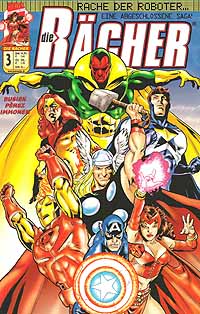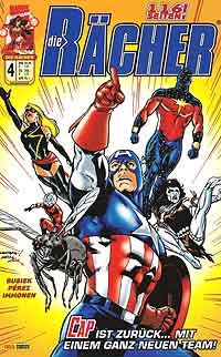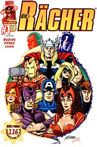 Alte Serie (bis Ende 2000) - 10 Ausgaben) Die Rächer #1, erschienen im Februar 2001 bei Marvel Deutschland Autor: Kurt Busiek, Zeichner: George Pérez In den ersten Geschichten dieser neuen Nummer 1 bekommen es unsere Helden mit anderen Heldengruppen zu tun. Zum einen wollen die Rächer herausfinden, ob Hawkeye wirklich freiwillig mit den Thunderbolts zusammenarbeitet und danach kommen sie den New Warriors zur Hilfe, die es mit einem sehr mächtigen Superwesen namens Lord Templar zu tun bekommen. Dieser möchte den Weltfrieden und ein neues kosmisches Gesetz auf der Erde zur Anwendung bringen. Leider scheint Lord Templar bei der Durchsetzung seiner Ziele aber auch Gewalt einzusetzen und dies können unsere Helden nicht zulassen. Der Kampf mit Lord Templar wird leider nicht zur vollen Zufriedenheit der Helden beendet und da ein neuer Gegner anscheinend nicht ausreicht, taucht noch ein weiterer Krawallschläger namens Pagan auf. Dieser scheint Lord Templar sogar zu kennen. Ein wenig Witz und Entspannung bringt der Besuch von Hank McCoy a.k.a. das Beast. Da dieser bei seinen Forschungen zur Heilung des Legacy Virus nicht weiterkommt, da die Computer erst etwas Rechenarbeit leisten müssen, sucht er seine alten Freunde und Teamkameraden auf. Natürlich gibt es auch wieder die persönlichen Probleme im Team. So ist die Beziehung, die Wanda mit Wonder Man führt, ,ja nicht einfach und die Wiedergenesung von Vision macht die Sache auch nicht einfacher. Justice ist sich plötzlich nicht mehr sicher, ob er wirklich noch ein Rächer sein will, da ihm das Zusammentreffen mit seinem alten Team sehr viel Spaß gemacht hat. Hinzu kommt, daß Captain America durch einen Vorfall in seiner Solokarriere nicht gerade voller Selbstvertrauen strotzt und es scheint, als ob das Team im Kampf nicht mehr so gut aufeinander abgestimmt ist, wie es früher der Fall war. Und in der Zukunft scheint es neben Lord Templar auch noch Ärger mit der aus dem Gefängnis ausgebrochenen Wrecking Crew zu geben und Hank Pym scheint, ohne es zu wissen, seiner finsteren Schöpfung Ultron etwas in die Hand zu geben, mit dem dieser endlich seinem Ziel von der Vernichtung der Rächer recht nahe kommen könnte. Hat man wie ich gerade ganz begeistert die Saga "Rächer aller Zeiten"