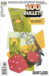 Link zur Ausgabe #1- #5 100 Bullets #6, erschienen im Januar 2000 bei Vertigo (DC) Autor: Brian Azzarello, Zeichner: Eduardo Risso, Farben: Grant Goleash, Seperation: Digital Chameleon, Letterer: Clem Robins, Assistent Editor: Cliff Chiang, Redakteur: Axel Alonso, Cover: Dave Johnson In dieser Ausgabe lernen wir Chucky und Pony kennen. Chucky ist ein Würfelspieler und einer der besten. Er gewinnt immer. Doch leider läßt ihn niemand mehr an einen richtigen Würfeltisch heran. So muß Chucky sein Geld auf der Straße verdienen und dies birgt immer die Gefahr, dass seine Mitspieler irgendwann wütend werden und ihn umlegen wollen. Doch wenn es brenzlig wird, dann hilft ihm seine Freundin Shantay. Chucky hat ein Problem. Er schuldet jemanden einen Batzen Geld und als er diesem eine Rate bezahlen will, erfährt er, dass jemand anderes nun seine Schulden gekauft hat. Es ist Chuckys alter Freund Pony. Pony hat es im Gegensatz zu Chucky zu etwas gebracht. Er spielt mit den großen Fischen und dies ohne großes Risiko. Chucky gefällt es nun gar nicht, dass er seinem Freund nun etwas schuldet. Als er Pony aufsucht, sagt dieser aber, dass Chucky keine Schulden mehr bei ihm mehr hat. Chucky kann die Sache beruhigt vergessen. Pony bittet Chucky aber darum, dass er endlich mit dem Spielen aufhören soll. Diesen Rat schlägt Chucky aber aus. Eine andere Straßenecke und ein neues Spiel. Diesmal erwischen ihn seine Mitspieler. Doch gerade im rechten Moment taucht ein seltsamer Typ im schwarzen Anzug auf. Er stellt sich Chucky als Agent Graves vor und er erzählt ihm etwas. Er erzählt ihm davon, das es einen Autounfall gab. Chucky, der damals sehr betrunken war, dachte immer, dass er an diesem schicksalhaften Tag gefahren sei. Nein, es war Pony. Erst nach dem Unfall hätte Pony Chucky ans Steuer gesetzt. Chucky war dafür sieben Jahre lang in den Knast gegangen. Außerdem ist es Pony, der nun jedem, der es wissen soll, erzählt, dass Chucky beim Würfeln betrügt. Danach überreicht Agent Graves Chucky eine geladene Pistole. Brian Azzarello erzählt wunderbare Geschichten über Verlierer, die plötzlich die Chance bekommen, sich für ein Unrecht zu rächen. Eduardo Risso zeichnet wunderbare Bilder, die einem das Comiclesen zu etwas ganz Besonderen machen. Bei dieser Serie stimmt einfach alles. Wer "100 Bullets" nicht liest, der verpaßt etwas ganz Besonderes. Die deutschsprachigen Sammelbände dieser Serie sind bei "Speed/Verlag Thomas Tilsner" erschienen. |