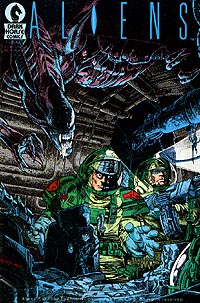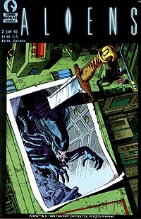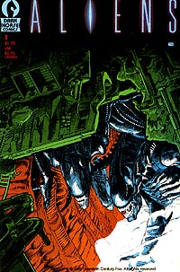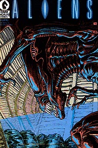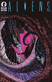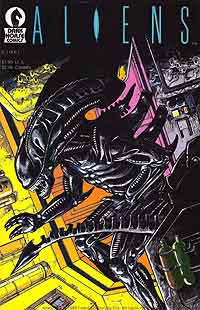 Link zur Ausgabe #2, #3, #4, #5, #6 Aliens #1 (Vol.1), erschienen im April 1989 bei Dark Horse Comics. Autor: Mark Verheiden, Zeichner: Mark A. Nelson, Letterer: Willie Schubert Zehn Jahre nach der Handlung des James Cameron Films. Newt ist durch einen bösen Traum schreiend und panisch erwacht. Sie träumte, daß sie wieder ein Kind ist. Sie ist zusammen mit anderen Kindern. Sie hatten sich aus der Basis gestohlen, um sich in einem geheimen Versteck etwas Lagerfeueratmosphäre zu schaffen. Es werden Geistergeschichten erzählt. Geschichten von Vampiren und als Newt dran ist, will sie vom Hexer erzählen. Doch ihre Begleiter fordern härtere und grausigere Geschichten und Newt fängt an, von einem Monster zu sprechen, das böse und unverwundbar zu sein scheint. Als sie erzählt, beginnen sich ihre Freunde zu winden und dann brechen Aliens aus den Bäuchen der Kinder heraus. Und dann ist sie schreiend auf dem Flur einer Klinik erwacht. Sie wird festgeschnallt und mit starken Drogen ruhig gestellt. Auch ein Soldat träumt. Er ist Hicks. Er hat überlebt. Doch die Träume lassen auch ihn nicht mehr los. Hicks hat nicht nur die Spuren des Alienblutes auf seinem Gesicht von seinem Einsatz auf dem Planeten mit Namen Acheron behalten. Hicks sieht sich wieder durch die Station hetzen. Zusammen mit seinem Trupp. Zwei seiner Leute, Vasquez und Drake, sind zurückgeblieben, um die Alienflut ein wenig länger im Schach zu halten. Immer wieder läßt er Gewehrsalven auf die scheinbar unsichtbaren Gegner los. Dann sieht er die Körper mit aufklaffenden Bäuchen und eingewoben in den Netzen der Aliens. Sie bitten um Hilfe. Hicks wacht auf. Gerade in diesem Moment wird die Zelle, in der er untergebracht ist, geöffnet. Ein Roboter gibt ihm eine Disk und Anweisungen. Hicks soll sich mit einem gewissen Colonel Stephens treffen. Alles begann mit einer von Begegnung, die die Besatzung eines Patrouillenbootes hatte. Bei einer Routinesprengung eines leerstehenden Frachters entdeckte die Patrouille seltsame Spuren. Doch sie hatten wenig Zeit. Bevor das Wrack in die Atmosphäre des unter ihnen liegenden Planeten eintreten konnte, mußte das Schiff zerstört werden. Es wurde also gesprengt. Doch dann entdeckten die zwei Männer des Patrouillenbootes ein Wesen. Dieses verschaffte sich Zugang zu den Männern und ließ das Vakuum des Alls in das kleine Schiff, das dem Druck nicht standhalten konnte und explodierte. Als Hicks den Bericht sieht, weiß er, was er tun soll. Währenddessen bereitet sich einer von vielen der unzähligen Fernsehprediger auf die Vorstellung eines neuen Gottes vor. Er wird das Alien als ein Wesen voller Kraft und Lebenswillen seinen Gläubigen vorstellen. Die Kirche der unbefleckten Empfängnis geht auf Sendung. Newt bricht erneut vor anderen Patienten zusammen. Sie läßt einen Ausbruch voller Zorn und Wut aus sich heraus. Erneut wird sie überwältigt und ruhig gestellt. Hicks trifft mit Colonel Stephens und einem Genforscher mit Namen Orona zusammen. Diese haben nach der Auswertung aller Daten der beiden Schiffe, die mit dem Alien in Berührung gekommen waren, den Herkunftsort dieser Spezies gefunden. Sie fragen Hicks, ob er bereit wäre, mit einer Expedition noch einmal auf Alienjagd zu gehen. Wieder träumt Newt vom bösen Aliens. Dann wird sie geweckt. Sie hat einen Besucher. Hicks ist gekommen, um sie zu fragen, ob Newt mit ihm kommen will. Newt will zu gerne aus diesem irren Gefängnis heraus. Sie will nicht mehr mit Drogen vollgepumpt werden. Doch bevor sie richtig um Hilfe schreien kann, wird sie vom Klinikpersonal auch schon wieder zurück auf ihr Zimmer gebracht. Aliens #2 (Vol.1), erschienen im Januar 1989 bei Dark Horse Comics Autor: Mark Verheiden, Zeichner: Mark A. Nelson, Letterer: Willie Schubert Wir lernen etwas über das Alien und seine Rasse. Wir lernen etwas über den Kampf der Alienqueen, denn nur die Stärkste, die all die anderen besiegt, wird von den Drohnen in Sicherheit gebracht, um irgendwo einen neuen Stamm zu gründen. Die Drohnen bieten ihrer Königin jeglichen Schutz, den sie zu geben vermögen. Die Drohnen haben nur eines im Sinn, die Königin zu schützen und den Fortbestand der eigenen Rasse voranzutreiben. Es müssen für die Eier genügend Wirtskörper bereitgestellt werden. Wahrscheinlich lebten die Aliens auf einem Planeten mit extrem schweren Lebensbedingungen. Wahrscheinlich wurden sie ganz unbedacht aus diesem natürlichen Umfeld herausgerissen. Und nachdem sie ihre unwirtliche Heimat verlassen hatten, war ihnen kein Feind mehr zu stark und keine noch so unwegsamere Gegend zuviel. Ein Alien kann sogar notfalls in der Weite des Alls überleben. Es läßt sich solange treiben, bis ein neuen Wirt gefunden wird. Es ist perfekt. Perfekt um zu töten, um so für den Fortbestand der eigenen Rasse zu sorgen. In den Träumen und Tagträumen von Hicks und Newt gibt es nur zweierlei Dinge: die verlorenen Freunde und der Schrecken, den die Aliens gebracht haben. Colonel Stephens bereitet alles für den Abflug zur Heimatwelt der Aliens vor. Der Gedanke, daß Hicks, ein bekanntermaßen psychisch Angeschlagener, mit ihm fliegt, läßt ihn immer noch laut aufschreien. Leider sind die Alternativen indiskutabel. Newt ist in psychologischer Behandlung und über Ripley braucht erst gar nicht gesprochen zu werden. Auch auf höherer Ebene wird über die Mission gesprochen. Schon jetzt muß sicher gestellt sein, daß die Mission ein Erfolg wird. Dieser Erfolg soll durch den Einsatz eines Vollprofis abgesichert werden. Als erstes fällt ihnen ein Name ein: "Massey". Dieser ist eigentlich ein Intellektueller und doch hat er es trotz hervorragender Studiumsorte und Abschlüsse vorgezogen, für sein Land zu kämpfen. Er wurde ein hochdekorierter Soldat, der letzten Endes aber wegen Befehlsverweigerung aus dem Marinecorps austreten mußte. Seitdem arbeitet er für die Firma. Hicks treibt seine neuen Untergebenen, einen Haufen junger wilder Soldaten, zur Höchstleistung im Tra
