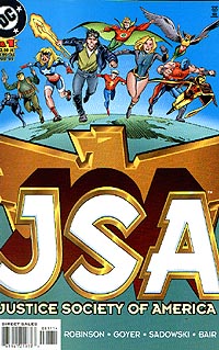 Links zu den Ausgaben #1, #2, #3, #4, #5, deutsche Ausgaben von Panini JSA Secret Files #1, erschienen im August 1999 bei DC Autor: James Robinson & David S. Goyer (1.Geschichte), Zeichner: Scott Benefiel, Tusche: Mark Propst, Letterer: Ken Lopez, Farben: John Kalisz Mt. Kailash, West Tibet. Ein Mann wartet auf seine letzte Aufgabe. Er wird hier den grauen Mann treffen. Dieses unsterbliche Wesen ist der Herr der Träume. Träume haben das Leben von Wesley Dodds beeinflußt. Von Träumen gelenkt, bekämpfte er als einer der Guten die Bösen. Bei diesem Treffen begleitet ihn ein alter Weggefährte. Speed Saunders ist bei Wesley, als der Graue Mann seine Worte sagt. Speed wird von Wesley zurück in die Welt der Helden geschickt, damit er Menschen zusammenbringt, die das Ausgesprochene mit Taten beantworten. Als der Graue Mann und Speed weg sind, bleibt Wesley stehen. Er wartet auf das Auftauchen der Gegenseite. Diese taucht in Form eines Mannes auf. Dieser ist ungehalten und bedrängt den alten Mann, ihm zu sagen, wo er das Kind, das noch nicht geboren ist, findet. Wesley springt, nachdem er sich selbst und den Feind von seinem Schlafgas kosten ließ, in die Tiefe. Alte Freunde sind über die Nachricht des Todes ihres Teamkameraden nicht erfreut. Es sind Flash, Wildcat, Wonder Woman und Sentinal (Green Lantern I). Die Nachricht spricht sich unter den Kreisen der alten Helden schnell herum. In Opal City erfahren Ted Knight und das neue Star-Sprangled Kid vom Tode des Sandmans. Am schwersten wird die Nachricht aber von Jack Knight, dem neuen Starman, aufgenommen. Wesley Dodds hat ihm sehr viel bedeutet. Auch der neue Hourman erfährt davon. Er erfährt davon natürlich viel früher. Eigentlich hätte Jay Garrick sich nicht die Mühe machen müssen, dem Androiden von dem feierlichen Abschied zu berichten. Wildcat bringt die Nachricht zu Atom Smasher, einem Mann, der das Blut zweier Superkräfteträger in sich hat. Black Canary wird von Wonder Woman unterrichtet. In Texas macht sich eine junge Frau auf, ihrer Berufung zu folgen. Sie wird das neue Hawkgirl. Und Sandy Hawkins bekommt das Erbe seines Ziehvaters in dieser Nacht übertragen. Sanderson Hawkins wird in dieser Nacht von Träumen geplagt. Mehr als interessant ist diese Ausgabe. Und als Fan von Wesley Dodds, dessen Abenteuer ich in den Seiten von "Sandman Mystery Theater" mit Spannung gelesen habe, ist dieser Anfang schon recht hart. Doch durch diesen Verlust scheint ein interessantes Team geschaffen worden zu sein. Zum mindestens dritten Mal wird hier die Wiederbelebung des Senior DC Teams JSA gefeiert. Zusammengerufen wurden nach dem Tode eines Helden viele Neulinge, die mehr Helden der zweiten bis dritten oder sogar vierten Generation sind. James Robinson und sein Co-Autor schaffen es wieder einmal eine betont persönliche Atmosphäre aufzubauen. Die Zeichnungen von dem für mich unbekannten Scott Benefiel unterstreichen den guten Gesamteindruck. Es folgen in diesem Einführungsspezial noch zwei weiter Kurzgeschichten und mehrere Profile der wichtigen Persönlichkeiten dieser neuen Serie, sowie Daten für all die, die noch etwas mehr über das alte Team namens Justice Society of America erfahren wollen. Irgendwie scheint mir dies ja ein Heldentrupp für all jene Helden zu sein, die nicht in das Team namens JLA hineinpassen. Auf deutsch sind auch schon einige Ausgaben der JSA-Serie bei Dino und jetzt bei Panini zu haben. Die zwei Kurzgeschichten wurden von Steven Grant und Ron Marz geschrieben und von Eddy Newell und Chris Weston gezeichnet. Die erste handelt von dem Zusammentreffen von Black Canary und Fate. Canary versucht Fate zu überzeugen, auch zum Treffen zum Andenken von Wesley zu kommen. Dieser lehnt dankend ab. In der zweiten Geschichte geht es um den Konflikt der Generationen. Sentinal versucht dem Star-Sprangled Kid etwas von der guten alten Zeit zu erzählen und zu zeigen. Courtney Whitmore ist aber mehr als gelangweilt von dem alten Krempel. Erst der Platz, auf dem einst ihre Vorgängerin gesessen hat, flößt ihr etwas Respekt vor denen ein, die vor ihr da waren. JSA - Justice Society of America #1, erschienen im August 1999 bei DC Autoren: James Robinson & David Goyer, Zeichner: Stephen Sadowski, Tusche: Michael Bair, Letterer: Ken Lopez, Farben: John Kalisz, Seperation: Heroic Age, Editor: L.A. Williams, Chef Editor: Peter Thomas Kid Eternity wird von einem Unbekannten erledigt. Sanderson Hawkins träumt von seiner Kindheit. Er war damals der Golden Boy, der Sidekick des Sandmannes. Er bekämpft Ramulus. Dann ist der Kampf vorbei und ein bleicher Mann erscheint ihm. Es ist der Lord der Träume. Dann zerfällt Wesley Dodds vor seinen Augen zu Sand. Sanderson erwacht. Er wurde vom Schellen des Telefons geweckt. Am anderen Ende der Leitung ist Speed. Wesley Dodds Totenfeier. Alle sind sie da: Sanderson, Jack Knight, Ted Knight, Flash (Jay), Wildcat, Sentinal, Johnny Thunder, Wonder Woman, The Star-Sprangled Kid, Hourman, Al Rothstein und Black Canary. Wildcat erklärt Jack Knight, wer all die Anwesenden sind. Auf einem Friedhof, auf dem zumeist Helden beerdigt werden, stehen nun am Grab eines der ihren gleich drei Generationen von Helden. Jay hat, während Sanderson eine Rede hält, eine Vision. Er sieht Kent Nelson (Dr. Fate) vor sich. Dann verschwindet dieser, dafür taucht aus einem Dimensionstor der neue Fate auf. Dieser hat sein eigenes Messer im Rücken. Er stirbt mit den Worten, daß Wesley Dodds keinen normalen Tod gestorben ist. Dann tauchen plötzlich untote Mumienkrieger auf, die auch als Söhne Anubis bekannt sind. Es folgt ein Kampf. Nachdem dieser beendet ist, verschwindet auf mysteriöser Weise das Messer von Fate, hinter dem Anubis Söhne her waren, aus Fates Rücken. Dafür taucht der geheimnisvolle Held namens Scarab auf, der verkündet, daß nur die JSA die Welt vor dem sicheren Ende retten können. Nun ja. Leser, die das "JSA - Secret Files Special" gelesen haben, sind schon einmal viel schlauer als un